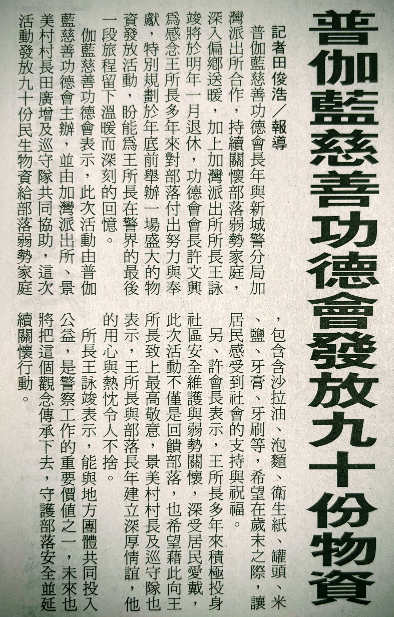 本次活動由普伽藍慈善功德會主辦,在加灣派出所協助轉介下,並由景美村村長田廣增與在地巡守隊全程配合完成物資發放。從前期盤點需求、整備物資,到現場動線安排與發送細節,每一步,都凝聚了地方與民間攜手的默契。